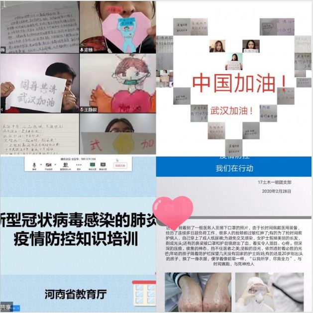 各班利用依托QQ群、微信群等网络平台,通过微视频、线上交流、手写祝福、网上承诺等形式开展主题活动,各班高度重视,精心设计,组织学习观看预防新型冠状病毒的知识和抗疫先锋的英雄事迹,并就“科学防控新冠肺炎我们该怎样做”、“如何在疫情防控中肩负青年人的使命担当”、“最美‘逆行先锋’让我感动的瞬间”、“停课不停学,我们与全国人民共奋进”等话题展开讨论。同学们纷纷表示:要坚定信心,科学防疫,从抗疫先锋的英雄事迹中汲取力量,学习他们坚毅勇敢、无私奉献的优良品质,懂得感恩,勇于承担起当代青年的责任和使命,与祖国同命运,与人民共患难,为夺取抗“疫”斗争胜利作出自己的贡献。